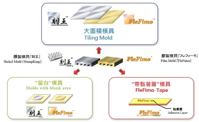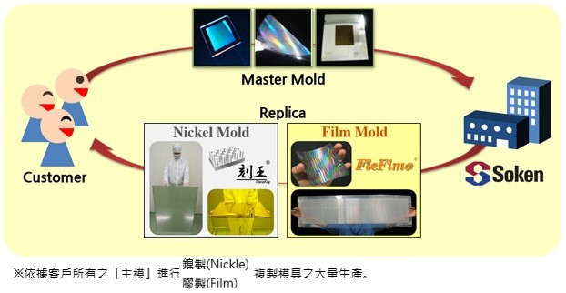 藉由客戶所擁有的「母模(Master Mold)」,高精度且大量生產「複製模」。「複製模」材質則分為鎳模、Film模兩種類。 Film模具『FleFimo®』透光性良好,適用於光固化奈米壓印製品。