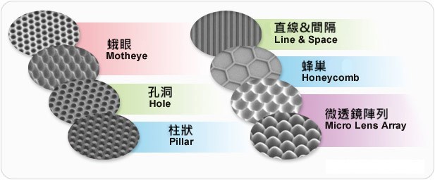 「母模(Master Mold)」,即奈米壓印所必須的標準模具。依據客戶需求進行圖樣結構設計與製造,並提供交期短且收費合理之服務。 若客戶要求在標準規格外,亦能提供設計製造服務。